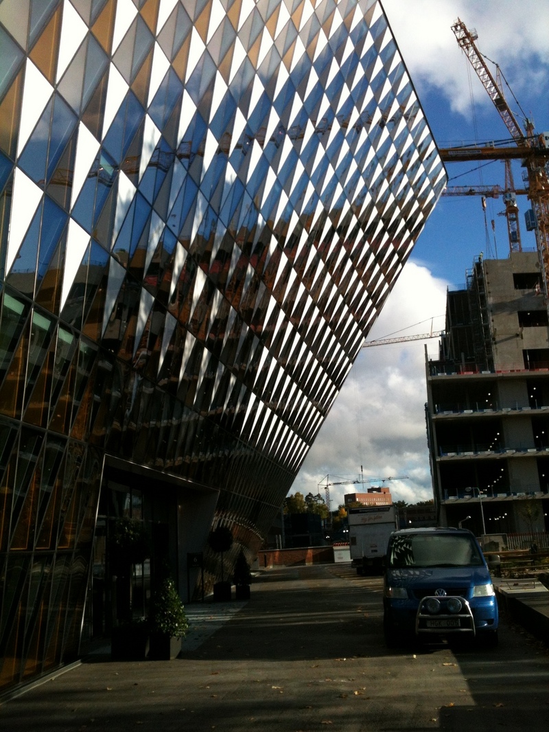 Fasadens 6 000 triangelformade glasrutor i olika nyanser av gult, vitt, guld och transparent ger ett fint och oväntat ljusspel invändigt. Även en disig dag ger färgerna en vision av solljus utomhus