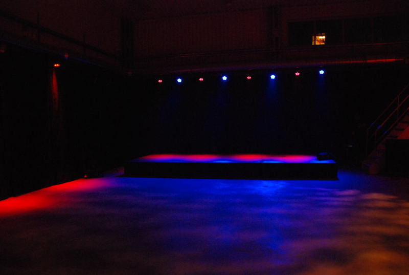 Svarta tyger täcker in väggarna, en scen byggs och allt ljussätts.